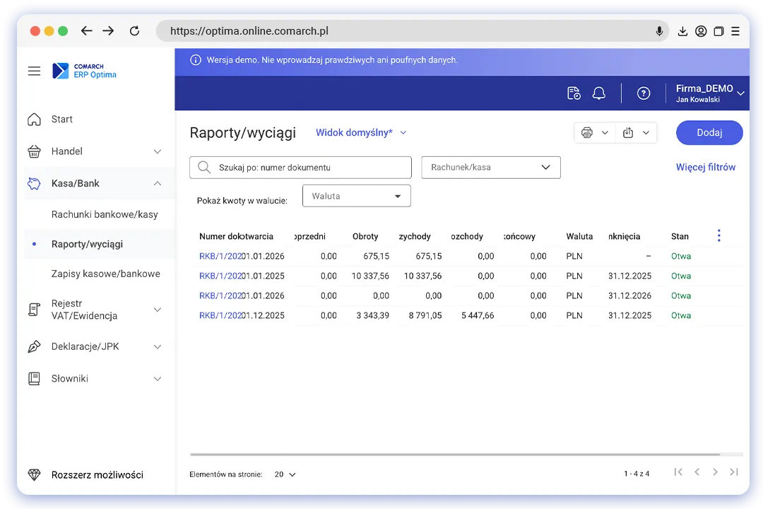Masz już konto Comarch Cloud? Skorzystaj z niego, aby przetestować Comarch ERP Optima w przeglądarce na optima.online.comarch.pl/demo