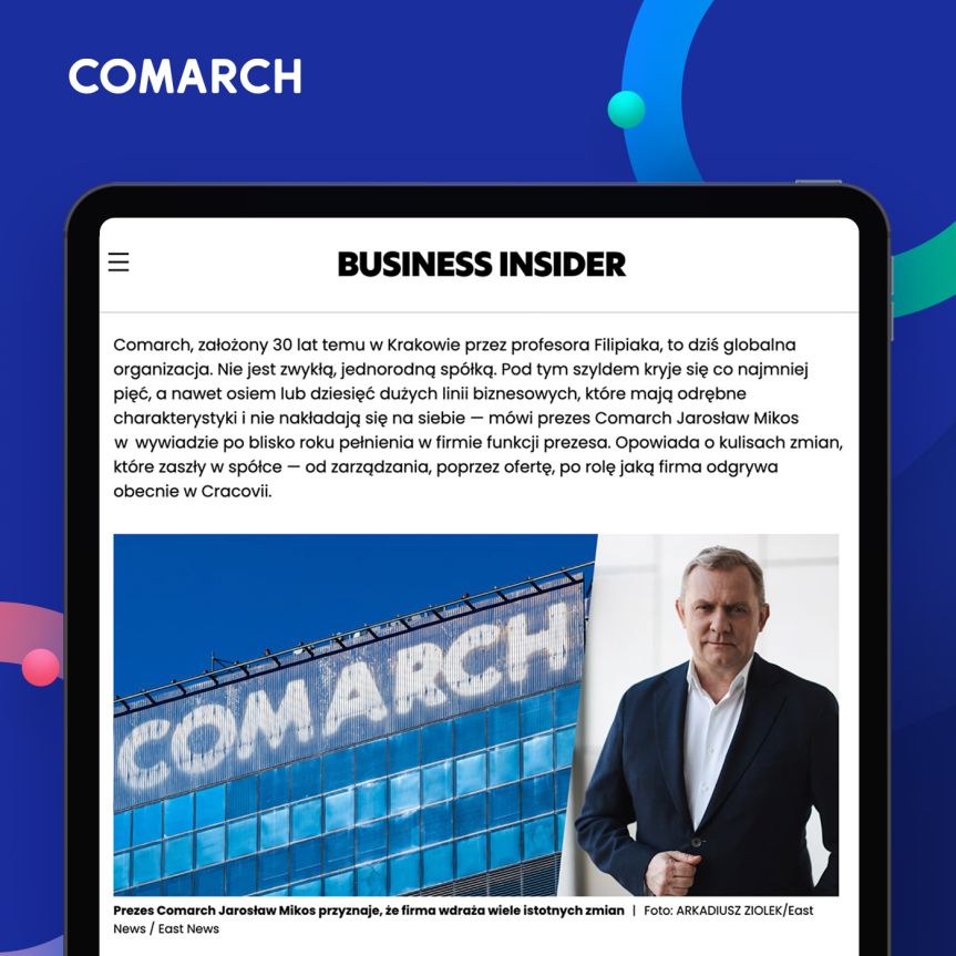 Wywiad, przeprowadzony przez Grzegorza Kowalczyka, dziennikarza Business Insider Polska stanowi podsumowanie pierwszego roku intensywnych zmian organizacyjnych i operacyjnych oraz wyznacza kierunek dalszego rozwoju Comarch jako globalnej i nowoczesnej firmy technologicznej.